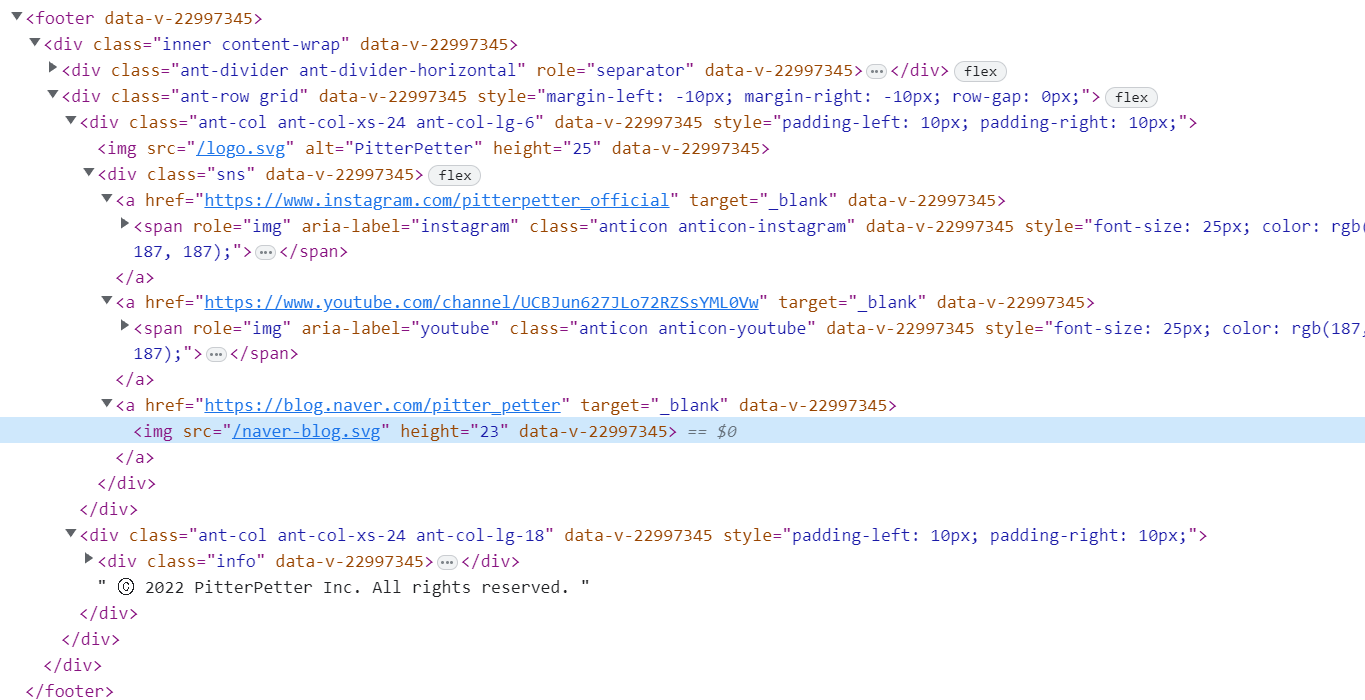 URL, 이미지, 텍스트, CSS 스타일이 적용된 푸터 영역의 HTML 소스를 예시로 첨부했습니다.