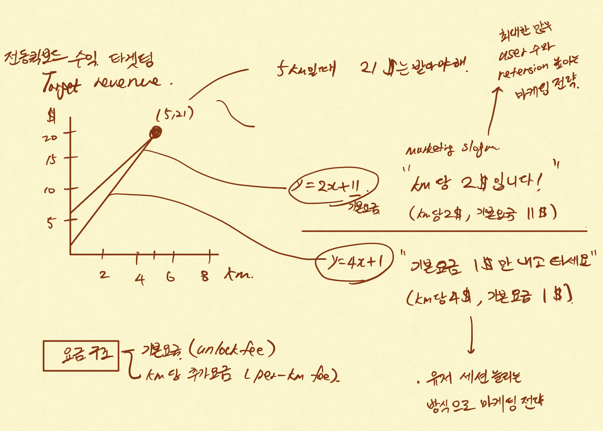 y = 5x + 1의 경우 기본요금은 1달러로 매우 저렴하지만 시급은 5달러로 경쟁사 대비 2배 이상 비싸다. 이 수익 구조의 핵심은 사용자 세션을 극대화하는 것입니다. 자주 사용하는 것이 맞겠지만 최대한 “오래” 킥보드를 탈 때 수익이 극대화됩니다. 경쟁사와 비교, 대조하여 우위를 점하는 마케팅을 하고 싶다면 “기본료가 11달러? 우리는 1달러만 청구한다”고 접근하면 된다. km 당 비용이 높기 때문에 경쟁자가 물고 반격할 수 있으므로 주의해야 합니다. 다른 수익 최적화 전략도 적절한 인프라를 설계할 수 있습니다. 등의 킥보드를 타고 장거리를 이동하는 사용자 경험 나. 킥보드를 타고 여행하는 것과 음식점 지도를 상품화할 필요가 있다. 킥보드는 단순한 이동수단이 아니라 봄바람을 직접 맞으며 야외 풍경을 빠르게 경험할 수 있는 일종의 ‘체험 상품’이어야 합니다. 타이어를 많이 팔기 위해 미쉐린 가이드를 만드는 미쉐린의 전략과 일맥상통한다.