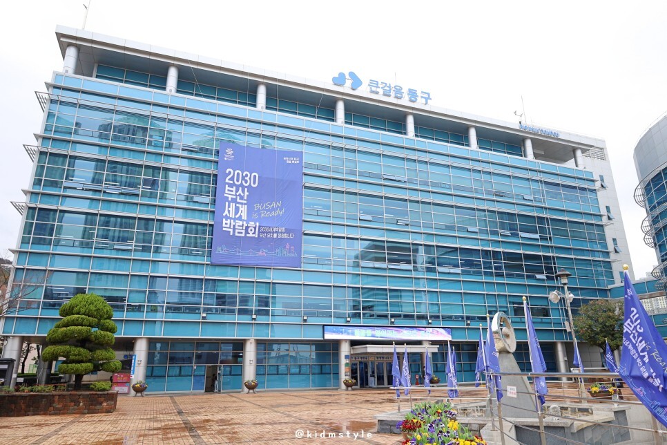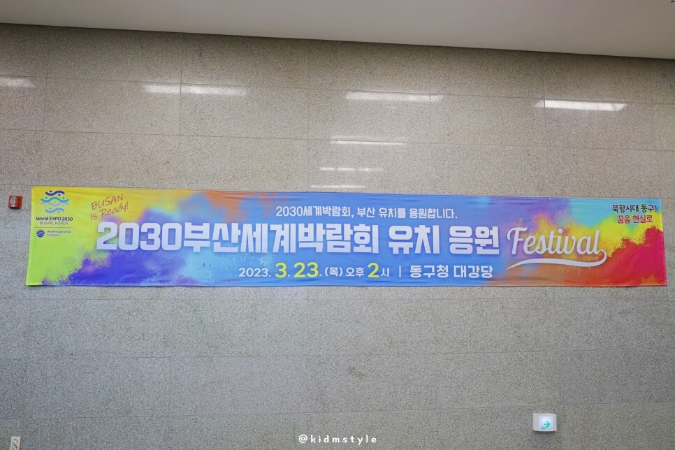 저는 동구에 사는데 동구청에 온지 정말 오래되었어요. 조금 일찍 도착하여 깔끔하고 잘 운영되고 있는 건물 주변을 산책한 후 행사에 입장하세요. 2030 부산세계엑스포 유치전 외벽에 걸린 파란색 포스터를 보면 실감이 난다.