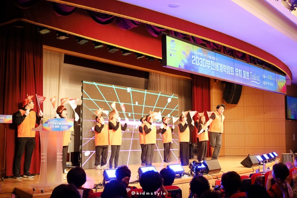 깃발이 달린 희년 무대도 열린다. 각 팀이 준비한 진정성 있는 무대들이 하나둘 모여 오늘의 2030 부산세계엑스포 유치 지원 페스티벌을 완성합니다. 즐겁고 신나는 무대를 하게 되어 정말 기분이 좋습니다.