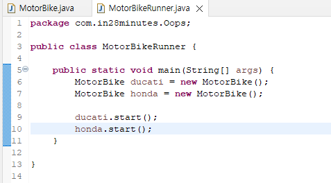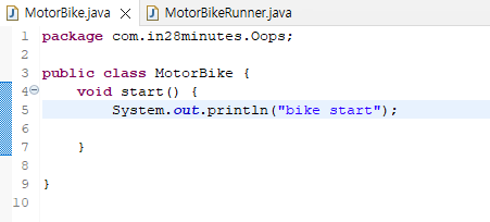 : MotorBike 클래스의 문제점은 MotorBikeRunner 클래스가 MotorBike 인스턴스 변수에 직접 액세스할 수 있다는 것입니다. MotorBikeRunner는 별도의 클래스이기 때문에 좋지 않습니다.